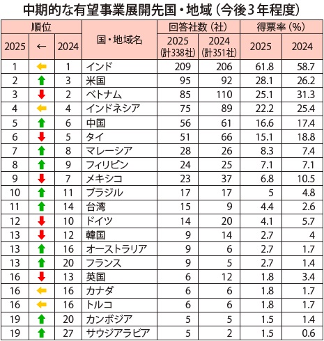 今後3年程度の有望事業展開先では、インドが60%を超える企業から支持を集めて1位となった。米国は堅調な経済や国内市場の魅力などを背景に得票率を伸ばし、24年度の3位から25年度は2位に上昇した。米国への進出は、トランプ政権の要望に応じた動きもあるが、大きな国内マーケットに魅力を感じている企業が多くみられる。これまで有望国として票を集めていたASEAN主要国は、経済の落ち込みや他国企業の競争力激化も背景に中期的に得票率が低下傾向にある。中国は24年度から1つ順位を上げ5位となったが、得票率回復には至らず、国内での地場企業や他国企業との厳しい競走に晒される日本企業の姿も見られた。以前の中国一極集中から、ASEANに流れる動きがあったがASEAN地域でも競争が厳しくなり、インドに目を向けるようになっている。