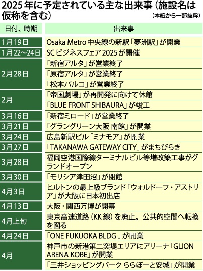 2025年は3月に東京・高輪ゲートウェイ駅前で「TAKANAWA GATEWAY CITY」のまちびらきを迎え、4月には大阪・関西万博が開幕する。また、三井不動産が春、夏、秋に「ららぽーと」などの開業を予定し、イオンモールは秋に2つの新規開業を控えるなど様々な動きがある。一方で「新宿ミロード」「新宿アルタ」など街を代表する施設の営業終了も予定されており、時代は移り変わっていく。25年に予定されている主な商業施設関連の出来事をまとめた。