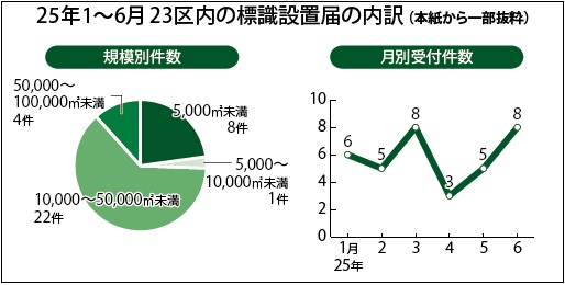 本紙は、東京都で受付された2025年1~6月の標識設置届(主に1万m²超の建築物が対象、ただし増築による変更届など一部例外あり)をまとめた。届け出数は島しょ部を含む全数が36件、うち東京都23区内は35件で、延べ10万m²を超える大型開発はゼロだった。前年同期(24年1~6月)比では、延べ床は100万m²以上の減少となった。