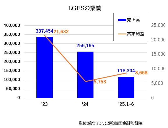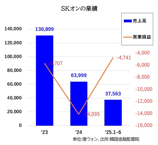 25年上期(1~6月)業績として、LGESは売上高が前年同期比3.7%減の11兆8304億ウォンとなったが、営業利益は同145.8%増の8668億ウォンだった。一方、SKオンは売上高が3兆7563億ウォンだが、営業損失が4741億ウォンと依然赤字が続いており、25年通期業績で長らく続く赤字経営からの脱出が求められている。