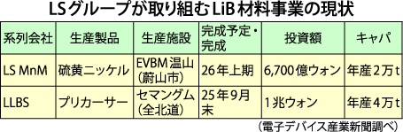 韓国は需要の90%強のプリカーサーを中国から輸入しており、サプライチェーン内で国産化が求められていた。また、LSグループの非鉄金属製錬系列会社であるLS MnM(蔚山広域市蔚州郡)は、26年上期に大規模な硫黄ニッケル生産拠点のEVBM(EV向けLiB材料)工場(蔚山広域市温山邑)を完成させる計画だ。現状で温山製錬所の敷地内に6700億ウォンを投じて建設しており、年間キャパシティーは2万tとなる。