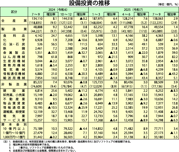 財務省は、四半期別法人企業統計調査2025(令和7)年7~9月期を発表した。これによると金融業、保険業を除く設備投資額は13兆8063億円で増加率(前年同期比)はプラス2.9%(前期はプラス7.6%)となった。