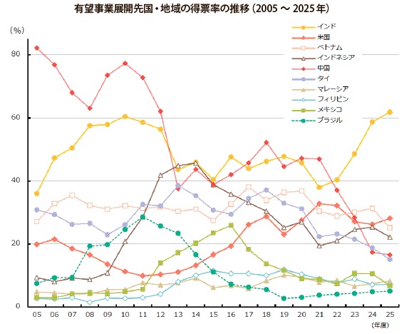 今後3年程度の有望事業展開先では、インドが60%を超える企業から支持を集めて1位となった。米国は堅調な経済や国内市場の魅力などを背景に得票率を伸ばし、24年度の3位から25年度は2位に上昇した。米国への進出は、トランプ政権の要望に応じた動きもあるが、大きな国内マーケットに魅力を感じている企業が多くみられる。これまで有望国として票を集めていたASEAN主要国は、経済の落ち込みや他国企業の競争力激化も背景に中期的に得票率が低下傾向にある。中国は24年度から1つ順位を上げ5位となったが、得票率回復には至らず、国内での地場企業や他国企業との厳しい競走に晒される日本企業の姿も見られた。以前の中国一極集中から、ASEANに流れる動きがあったがASEAN地域でも競争が厳しくなり、インドに目を向けるようになっている。