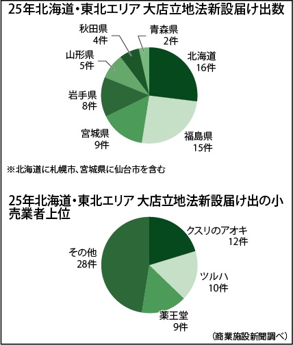 本紙がまとめた北海道・東北エリア(北海道、青森県、岩手県、宮城県、秋田県、山形県、福島県)における2025年大店立地法の新設届け出は、前年より6件少ない59件だった。エリア別で最も届け出が多かったのは北海道の16件(札幌市を含む)で、福島県の15件が続いたが、北海道と宮城県の届け出数が大きく減少した。小売業者では(株)クスリのアオキの12件が最多となるなど、上位1~3位をドラッグストア(DgS)が占めた。