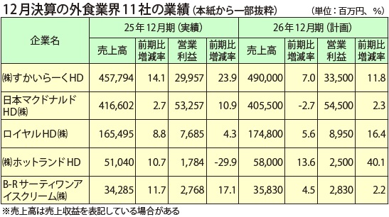 商業施設新聞は、12月期決算の外食業界11社の動向をまとめた。2025年12月期は日本マクドナルドホールディングス(株)、(株)すかいらーくホールディングスなど、業種問わず各社が増収となった。日本マクドナルドHDは120店の新店をオープンするなど積極出店も目立ち、店舗投資が進んだ一方で、営業利益は企業によって明暗が分かれた。材料費の高騰、出店・退店費用の計上などが要因で、26年12月期も材料費の高騰などは続くとみられ、今後の舵取りが注目される。