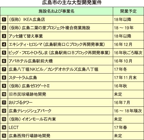 広島市内の街づくりや商業開発が、JR広島駅及び周辺に集中している。特に新幹線口側の北口周辺と繁華街へ向かう南口で計画されている。北口では二の葉里プロジェクトやIKEA広島店の出店が予定されている。B・C区画でタワーマンションや商業施設などを導入する市街地再開発事業が進行している。また、郊外ではイオンモールと地元のイズミの競争激化が予想される。