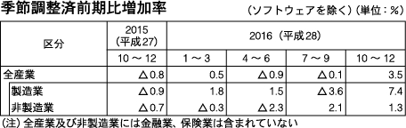 財務省は、四半期別法人企業統計調査2016(平成28)年10~12月期を発表した。これによると、金融業、保険業を除く設備投資額は10兆9350億円で増加率はプラス3.8%(前期はマイナス1.3%)となった。