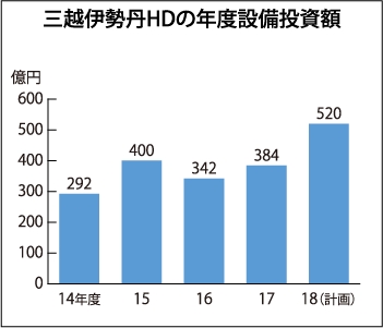 三越伊勢丹ホールディングス(株)の2018年度の設備投資計画は、前年比35.4%増の520億円に設定している。旗艦店のリモデル投資となる「戦略投資」、デジタル関連の「システム投資」を大幅に増やし、将来に向けた体制作りを行う考えだ。