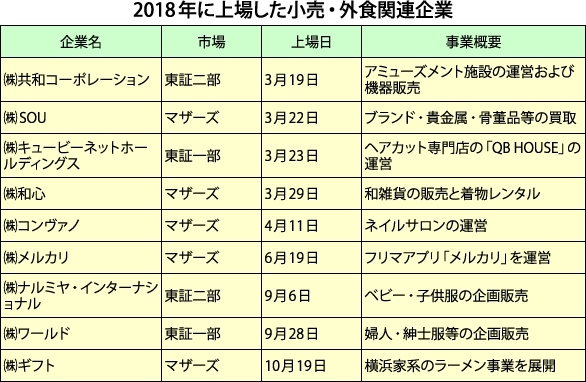 2018年に株式市場に上場した企業は17年とほぼ同水準の90社強となり、このうち小売・外食関連企業は、共和コーポレーション、SOU、キュービーネットホールディングス、和心、コンヴァノ、メルカリ、ナルミヤ・インターナショナル、ワールド、ギフトの全体で9社で大まかに小売り・サービスが8社で外食は1社となった。
