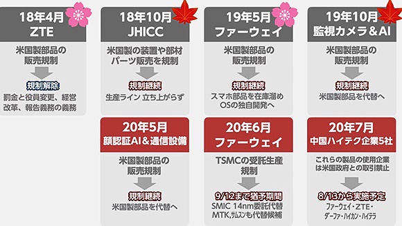 米中両国は関係修復の糸口を見出せないまま、5月下旬の全国人民代表大会の後さらに関係を悪化させている。TSMCの劉徳音CEOは7月中旬の株主会議で、9月14日以降もハイシリコンからの受託を受けない方針を決めたと語った。猶予期間内の根本解決はもはや望めない状況になった。