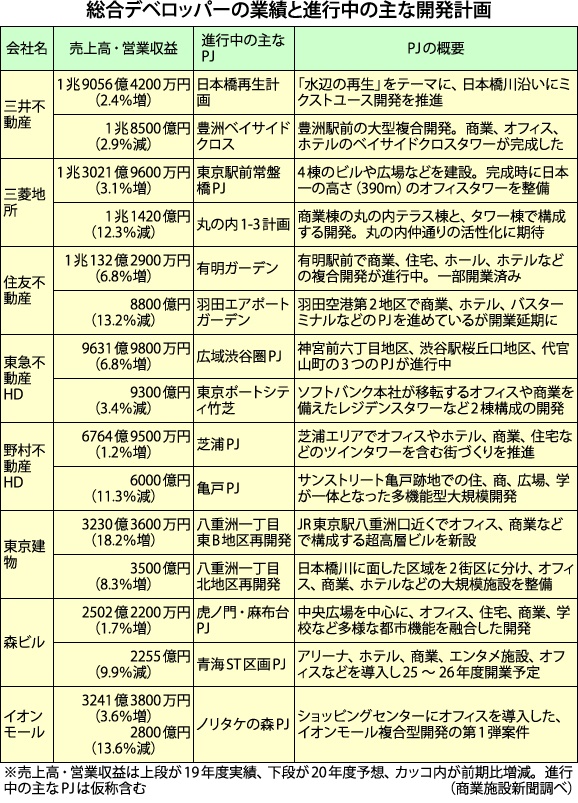 総合デベロッパーは、東京都心部を中心に商業、住宅、オフィス、ホテルなどの多機能を備える複合開発・街づくりを推進している。商業専業デベロッパーのイオンモール(株)を含む売上高・営業収益上位8社の主なプロジェクト(PJ)は表のとおりで、多機能を導入することにより、単一機能ではない“街づくり”を色濃くした開発を各エリアで進め、街に人を呼び込むことに注力している。一方で、コロナ禍により、街づくりに対するニーズなども変容しつつあり、より選ばれる街を目指すべく、地域の魅力や特徴づけ、エリア活性化がより重要になりつつある。