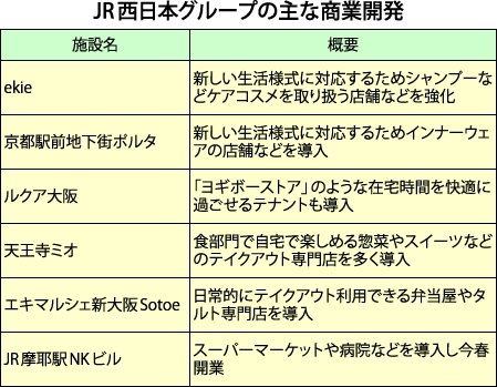 JR西日本グループはコロナ禍でも積極的に商業開発を続けている。既存施設の改装では「おうち時間」をより快適に過ごせるようなテイクアウト店などを導入している。一方、三ノ宮駅の再開発ではコロナ禍による業績悪化などで整備計画の見直しを図っている。