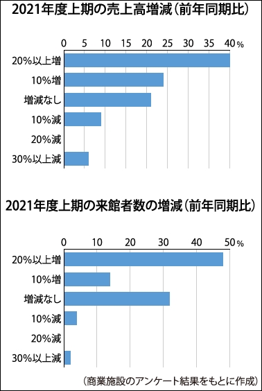 本紙はデベロッパーや商業施設運営事業者を対象に「コロナ禍における商業施設の運営・管理 アンケート調査」を実施した。有効回答率は85%、10社/52施設。調査によると、2021年度上期の売上高および来館者数が前年同期比20%以上増を記録した施設は40%以上を占めた。