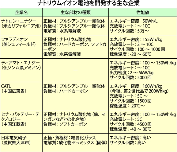 NaiBを開発している企業としては、先述のCATL以外にナトロン・エナジー(Natron Energy)、ファラディオン(Faradion)、ティアマト・エナジー(Tiamat Energy)、ヒナ・バッテリー・テクノロジー(HiNa Battery Technology)、日本電気硝子などが挙げられる。