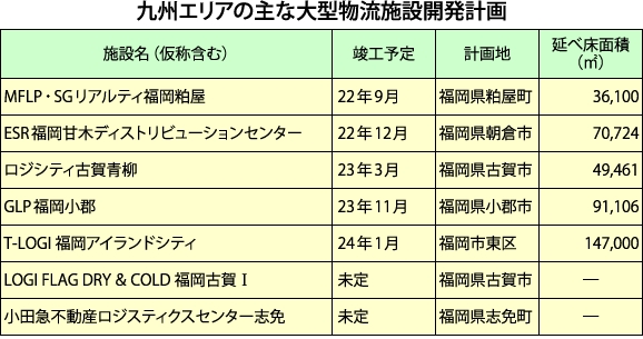 ECの拡大や施設の先進化ニーズが後押しし、物流施設の開発が全国で進んでいる。その中でも九州エリアの大型物流施設は、9月以降に7件(商業施設新聞調べ)が竣工するなど活発。とりわけ福岡空港、博多港などに近接する九州自動車道・福岡IC付近や、九州自動車道(縦貫)と長崎自動車道・大分自動車道(横断)の結節点である鳥栖JCT付近の小郡市などの開発が目立つ。福岡圏の空室率は0.0%と空きがない状態で、各デベロッパーは福岡周辺で開発を加速する。